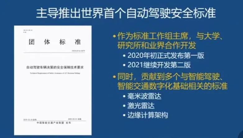 作为标准工作组的主席,2018年开始,英特尔和国内的一些大学,包括清华大学、同济大学、南方科大、中国科学院自动化研究所一起,在交通部公路科学研究院的支持下,在自主车辆的安全、数据集与评测、交通基础设施、前沿算法与系统架构、V2X以及标准等核心领域开展广泛和深入的合作。去年初,第一版团体标准《自动驾驶车辆决策的安全保障技术要求》发布,第二版将在今年发布。