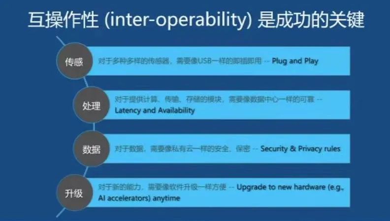 第二是处理,分为计算、传输和存储,这些都要有相应的规范,模块之间要有一个接口协议来认证,以便模块之间约定如何衔接,以什么样的算力提供什么样的能力、什么样的延迟。互操作性还能够保证可靠性,比一般应用于其他领域(如娱乐、游戏)的一些服务器、边缘计算的要求高得多。