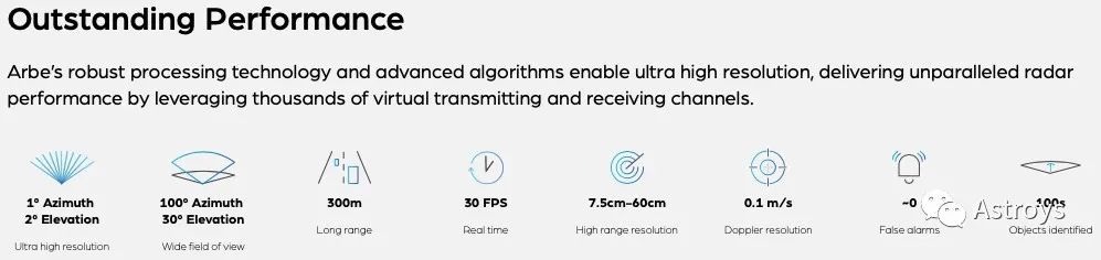 Arbe的性能Arbe的4D成像雷达芯片组解决方案将推出超高2K分辨率、30fps的成像技术、300m探测范围,以及高方位角和仰角分辨率。