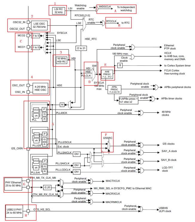 在STM32中,有五个时钟源,为HSI、HSE、LSI、LSE、PLL。