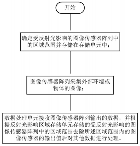 首先确定受反射光影响的图像传感器阵列中的区域范围并存储在存储单元中;然后图像传感器阵列采集外部环境或物体的图像;最后数据处理单元接收图像传感器阵列输出的数据,并根据反射光影响区域存储单元存储的受反射光影响的图像传感器阵列中的区域范围去除所述区域范围内的图像传感器的输出值后对其他数据进行处理。