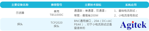 配置要求:针对电流实际特性,信号频率不是很,选配100M带宽足够,因为示波器的特性,电流探头就比较少,能承受的范围内选择TCP2020电流探头最好。