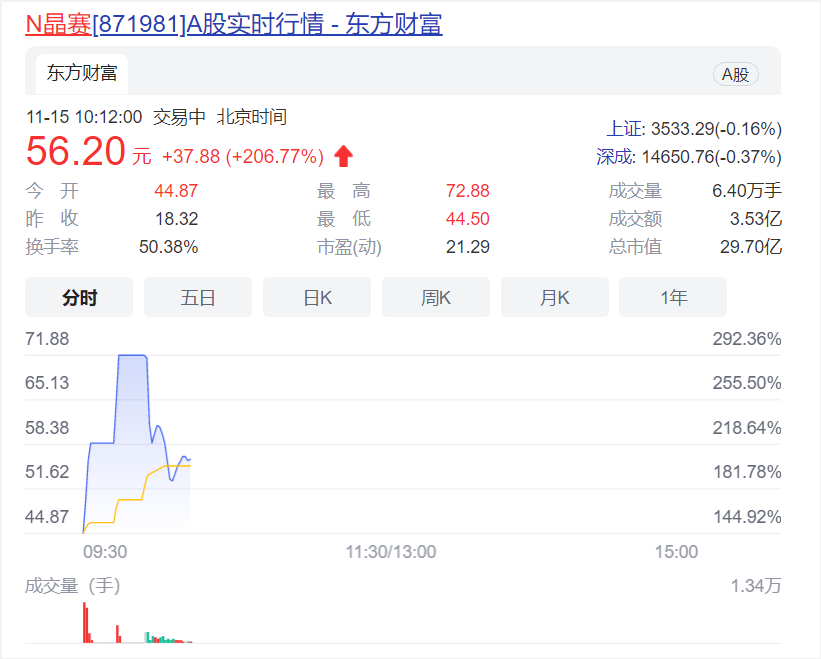 截止发稿时,晶赛科技股价为56.20元,涨幅达206.77%,总市值达29.70亿元。