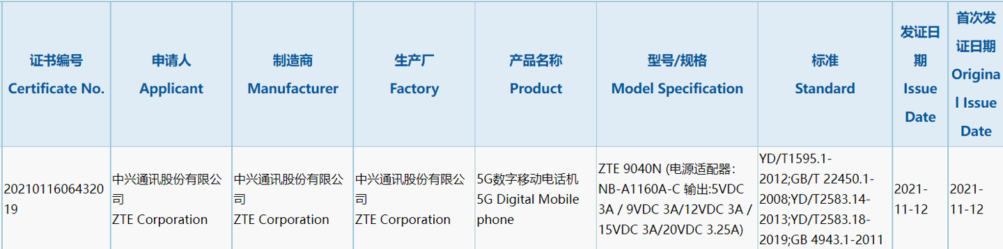 2021年11月16日 | 中兴新机通过3C认证:支持65W快充,或为S40系列