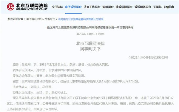 京互联网法院网站显示,近日相声演员岳龙刚(岳云鹏)与北京完美创意科技有限公司相关网络侵权责任纠纷一审法律文书公开。