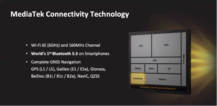 在连接方面,天玑9000支持支持蓝牙5.3,支持 Wi-Fi 6E 2x2MIMO 支持即将到来的蓝牙 LE Audio,提供双链路真无线立体声音频体验,支持新型北斗3代-B1C GNSS。
