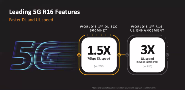 在5G方面,天玑9000集成的 5G调制解调器 MediaTek M80 符合 3GPP R16 标准,支持 Sub-6GHz 5G 全频段网络,3CC多载波聚合300MHz,使下行速率达 7Gbps,率先支持 R16 超级上行,包括补充上行和上行载波聚合两种;MediaTek 5G UltraSave 省电技术再升级,大幅降低 5G通信功耗。