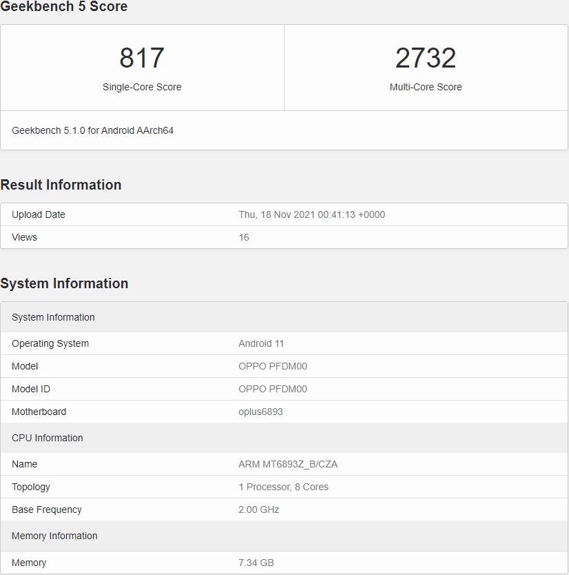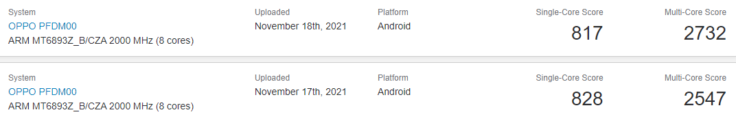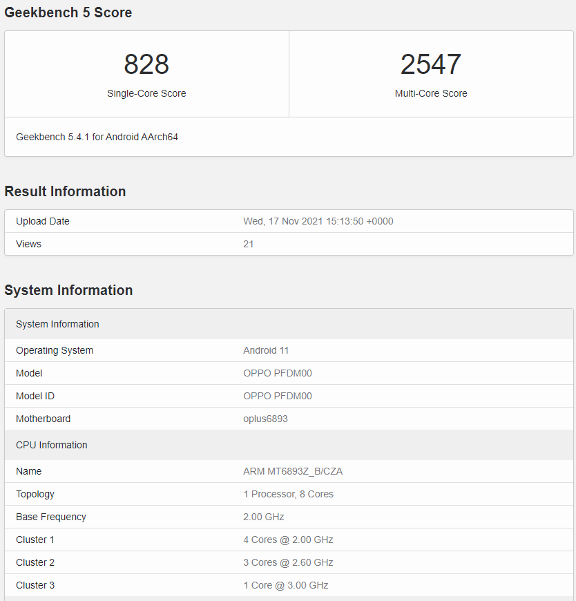 近日,OPPO PFDM00 出现在 GeenBench 5,有两次跑分,单核最高 828,多核最高 2732,搭载联发科天玑 1200 芯片,运行 Android 11 系统,内存为 8GB。