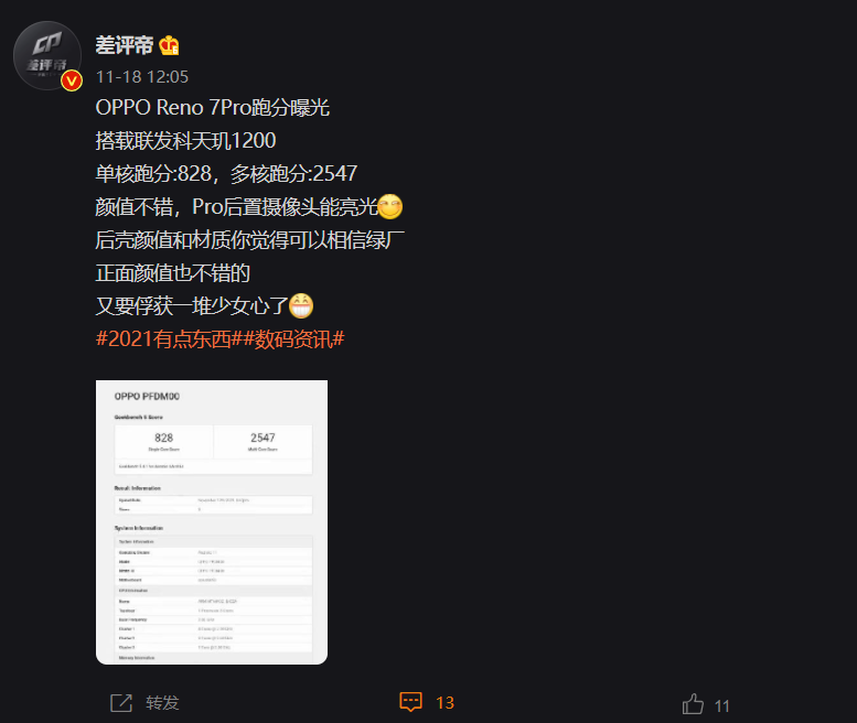 2021年11月19日 | OPPO Reno7 Pro跑分揭秘,搭载天玑1200