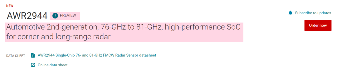 AWR2944 TI定义为第二代车规级高性能车载雷达芯片,目前处于Preview阶段。也就是可以提供芯片样品或者可供评估的demo板,未正式规模量产。