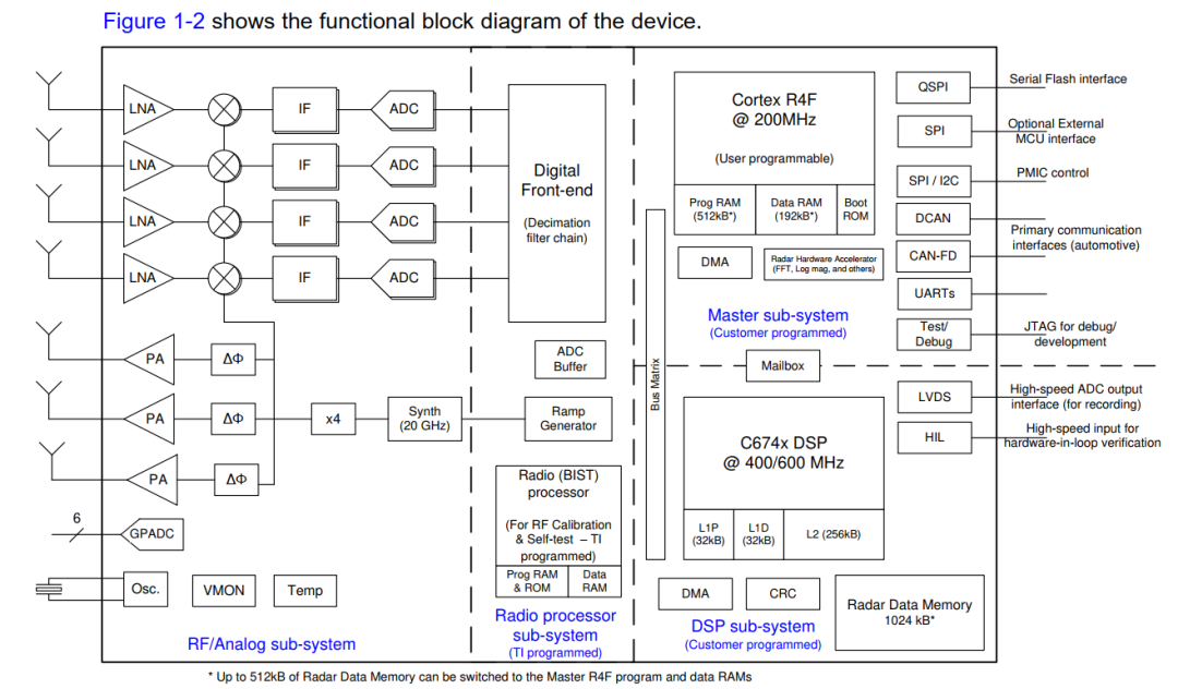 硬件架构如下图,AWR2944依旧是清晰的模块设计,前面介绍的各种调整与升级基本一目了然。我也放了AWR1843 的框图,大家方便对比。