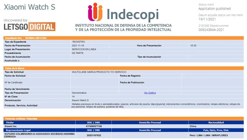 该商标申请于 2021 年 11 月 18 日在秘鲁向该国竞争与知识产权保护局(INDECOPI)提交。该商标被归类为第 9 类,描述如下:“智能手表;智能戒指;智能眼镜;手表形式的智能手机”。