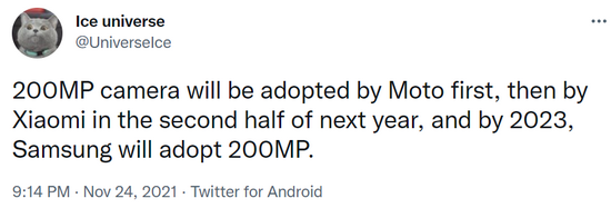 2021年11月25日 | 三星2亿像素传感器将由摩托罗拉首发,小米明年下半年采用