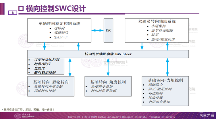 基于转向驾驶辅助功能主要是实现可变传动比控制,超前/滞后稳定域的控制,转向系统角度比,过度转向必须要和ESC进行协调控制,还有根据左右轮胎摩擦系数不一样的情况下面,转向也要进行主动干预。最终DAS应用场景就是车道保持,前车跟随,驻车,当前状态的反馈用到转向驾驶辅助功能。