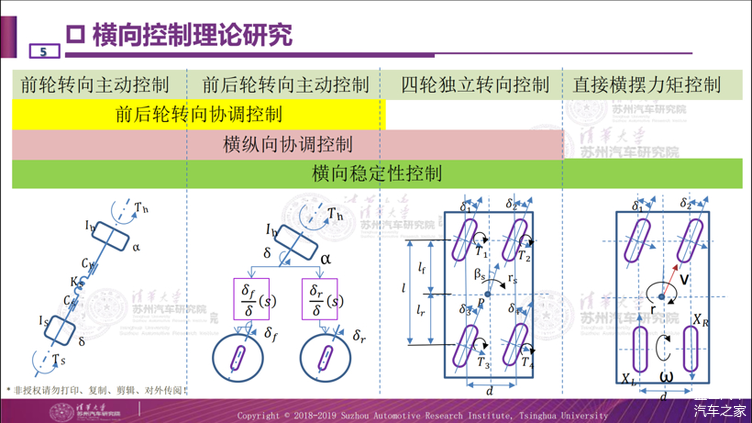 如图2,是横向控制理论研究的主要内容,前轮转向主动控制(线控转向)EPS或冗余的EPS,它对转向轮进行主动控制。前后轮转向主动控制,主要是后轮的主动控制,因为后轮转向干预可以更好的减少稳态侧偏角,整车转弯性能和制动性能都可以得到改善。目前后轮研究有几个传统的方案,后轮转向角根据前轮转角或者根据前轮转角的力矩,还有根据横摆速度进行后轮转向,这三种研究方向,目前行业里面都在做相关的研究。