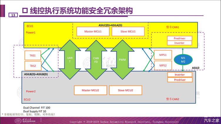 如图8,是线控执行系统冗余架构,双TAS,双MPS,中间是通过三总线联合方式,这在行业里面,有的是用两种。这是硬件冗余组件,其实就是通讯的冗余,电源的冗余,电机的冗余。