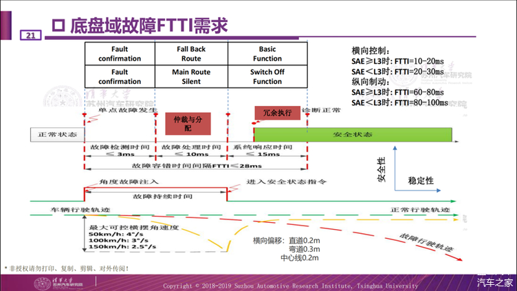 如图6,是智能底盘对线控转向的指标需求,设计到转向角的分辨率,转向角的速度,周期、带宽都是它的需求,保守助力,比如说常规的乘用车可能是50%基本助力,在有些特定的应用场景,特别是大型车可能是75%的基础助力。功能安全和预期功能安全也设计到指标需求里面去。