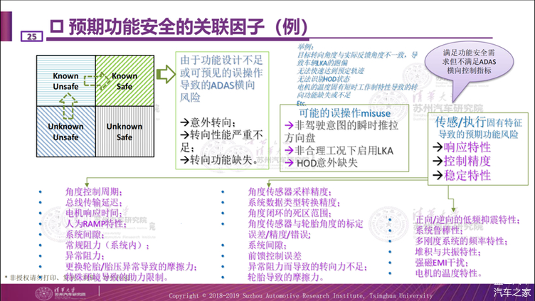如图15,是预期功能安全,所有的执行系统都集中在线控机构上面,固有的系统机构风险都在底盘上面,而不是算法层面的,固有的算法特征导致预期风险都在这边,所以从它的响应特性,控制精度,稳定特性角度而言要做预期功能安全关联因子的分析,对每一个关联因子进行模型或者算法的补偿优化。