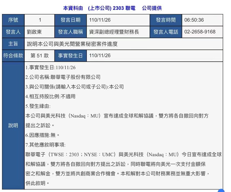 11月26日上午,联电发布公告称,公司已与美光达成全球范围内的和解协议,双方将各自撤回向对方提起的诉讼,同时联电向美光一次性支付一笔金额保密的和解金,未来双方将共同创造合作机会。另外,和解金将不会对公司业绩产生重大影响。