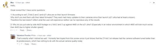 不过,在 DXOMARK 发布后,有网友发现测试中似乎在 Z Fold 2 和 3 上使用 4K30fps 镜头但 S21 Ultra 则采用 4K60fps 拍摄。,因此产生了一丝疑问,并表示:为什么不用最新的固件测试?