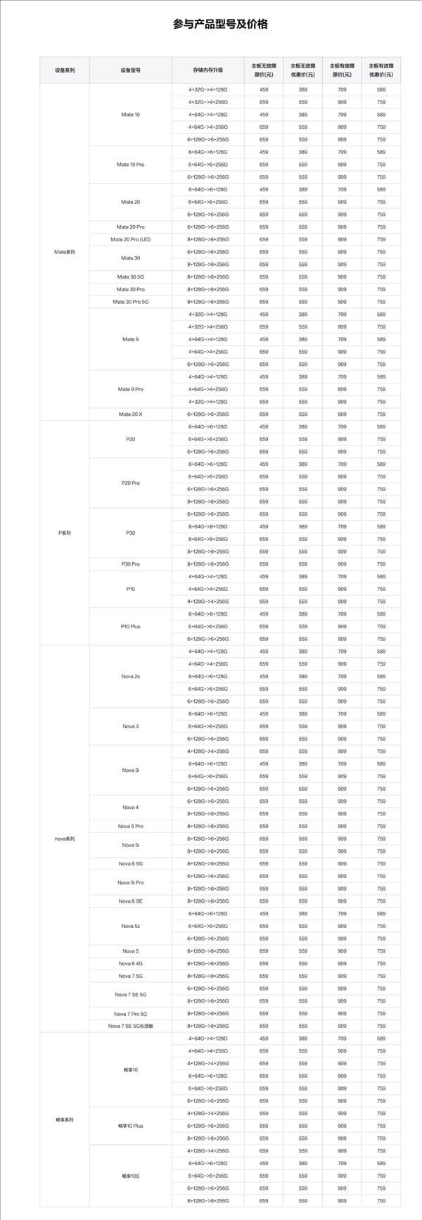 升级128GB存储,若主板无故障,价格为459元,优惠价389元,若主板有故障,价格为709元,优惠价589元;