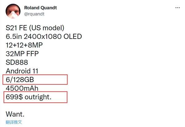 知名爆料人Roland Quandt曝光了三星Galaxy S21 FE美版的关键参数及价格。