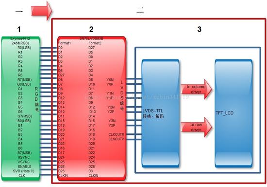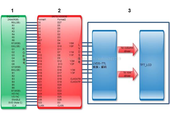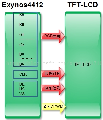 如上图所示,我们在应用中我,主控(Exynos4412)输出RGB信号到TFT-LCD大体经过三部分: