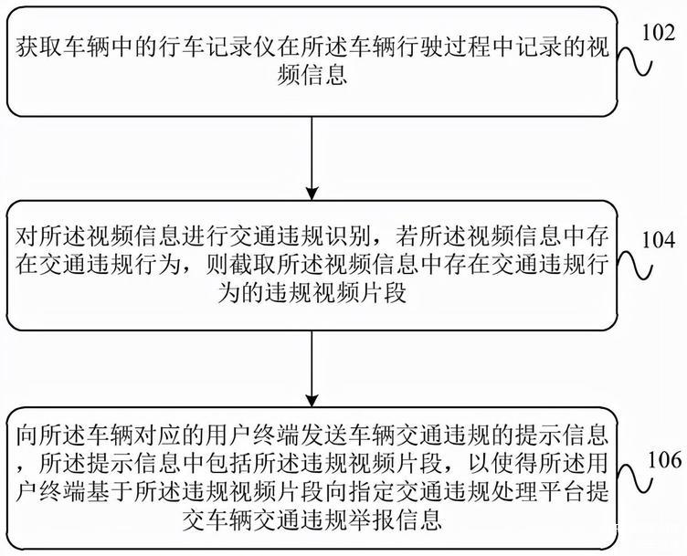 若存在交通违规行为,则截取存在交通违规的视频片段,并自动向车辆对应的用户终端发送交通违规的提示信息,以提醒用户及时举报车辆交通违规行为。整个视频抓取过程,无需用户手动操作。