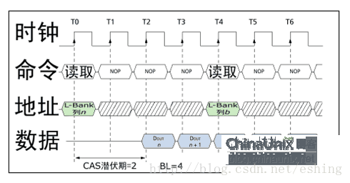 以上图14-14为例,CS#,RAS#,CAS#,WE#为L,L,H,H。则指令为Row/Bank Active;随后CS#拉高,command无效,在第4个时钟周期这4个信号变为L,H,L,H,对照表格,指令为Read,经过几个时钟周期延迟,在3CLK后读数据。