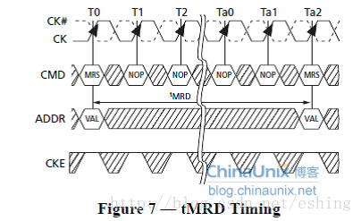 MRS: MODE Register Set, 模式寄存器设置。为了应用的灵活性,不同的功能、特征和模式等在DDR3芯片上的Mode Register中,通过编程来实现。模式寄存器MR没有缺省值,因此模式寄存器MR必须在上电或者复位后被完全初始化,这样才能使得DDR可以正常工作。正常工作模式下,MR也可以被重新写入。模式寄存器的设置命令周期,tMRD两次操作的最小时间,其具体时序图,如下图10-9所示。模式寄存器,分为MR0、MR1、MR2和MR4。