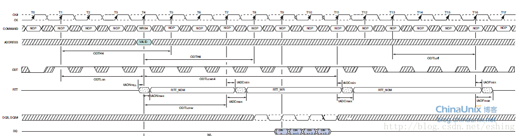 CWL:CAS write latency. 以时钟周期为单位,在内部写命令和第一位输入数据的时间延时,该单位始终为整数。在操作过程中,所有的写延时WL被定义为AL(Additive Latency)+CWL。