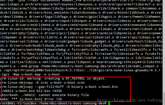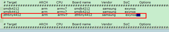 #include #ifdefCONFIG_EXYNOS4412 #include "zthtiny4412_val.h" #else #include "zthtiny4212_val.h" #endif 4、修改zthtiny4212_val.h 定位到13行,修改为: #ifndef_VAL_ZTHTINY4212_H #define_VAL_ZTHTINY4212_H 5、修改zthtiny4412_val.h 定位到13行,修改为: #ifndef_VAL_ZTHTINY4412_H #define_VAL_ZTHTINY4412_H 6、修改makefile 定位到33到38行,修改为: COBJS-y := zthtiny4412.o COBJS-y += pmic.o COBJS-y += smc.o SOBJS := lowlevel_init.o SOBJS += mem_init_zthtiny4412.o SOBJS += clock_init_zthtiny4412.o 7修改u-boot.lds 定位到40行,修改为: board/samsung/zthtiny4412/libzthtiny4412.o(.text) 8、复制include/configs/smdk4412.h为zthtiny4412.h 9、修改主目录下的makefile 定位到24行,修改为: VERSION = 2014 PATCHLEVEL = 01 10、修改根目录下的/boards.cfg的文件,既然是针对自己的板子进行修改,此文件中的其他设置可以不用了,增加自己板子的设置后,删除其他设置。这里我保留了三行,如下图1-2所示。 图1-2 boards.cfg示意图 简要的载剪工作到此为此,下一章说明启动过程。 10、编译 这一步主要是查看我们平台搭建成了没有:进入linux进行编译: 可能用到的命令并列如下以供参考 cp -R /media/sf_sharelinux/test/zhang_new_uboot/u-boot_zth/. chmod -R 777 /u-boot_zth / cd /u-boot_zth / make zthtiny4412_config make 结果如下图1-3所示,由下图结果所示,已看到了其产生了u-boot.bin文件了,后面的错误是由于目录下的mkbl2执行来产生BL2文件的错误,此错误我们搭建移植平台无关,可以打开主目录下的makefile,定位到350行左右注释了以下代码: #ifeq ($(CONFIG_S5PC210),y) # ./mkbl2u-boot.bin bl2.bin 14336 #endif #ifeq ($(CONFIG_CPU_EXYNOS5250),y) # ./mkbl2u-boot.bin bl2.bin 14336 #endif 也可以去include/configs/zthtiny4412.h文件下,把CONFIG_S5PC210和CONFIG_CPU_EXYNOS525给注释了。 下一节,开始分析启动过程。 图1-3 编译结果程序图