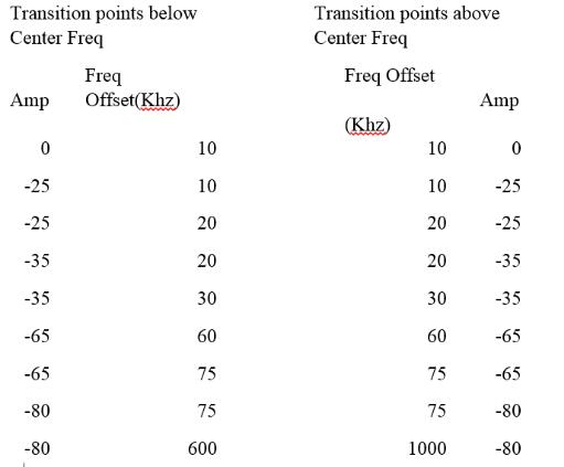 处理这些文件时,会将衰减限制绘制为直线段的集合。如果下点与上点具有相同的频率,则垂直绘制衰减曲线。虽然这些表描述了一个关于其中心对称的滤波器,但并不要求对称性。