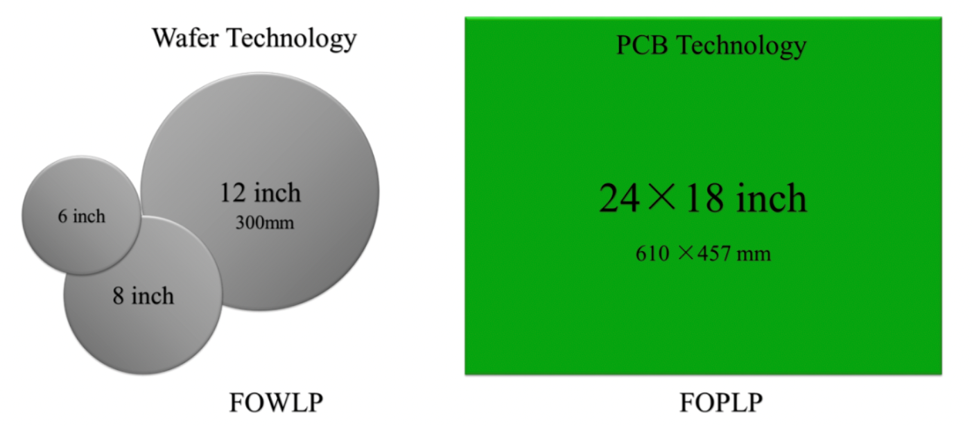 FOPLP采用了如24×18英寸(610×457mm)的PCB载板,其面积大约是300 mm硅晶圆的4倍,因而可以简单的视为在一次制程下,就可以量产出4倍于300mm硅晶圆的先进封装产品。