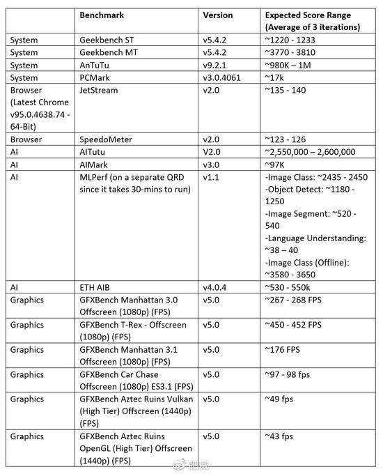 首先来个高通给出的骁龙8 Gen 1 QRD“正常发挥”跑分成绩的区间,个人觉得AI跑分太“虚”,没必要太纠结,可以多看看其他涉及AP性能的测试。不难看出,所有项目相比骁龙888都是有不同程度的提升的(除了GB5多核…)。