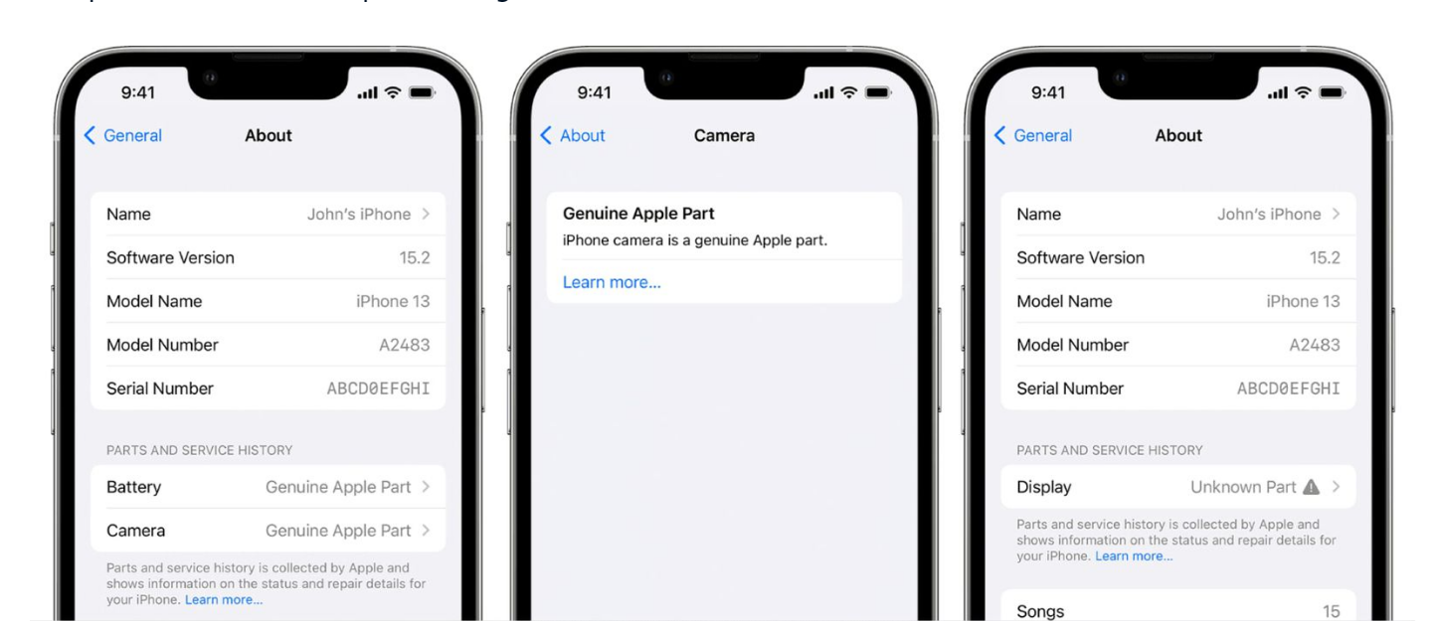 苹果在一份新的支持文件中称,安装了 iOS 15.2 或更高版本的 iPhone 用户可以进入设置 > 通用 > 关于,以查看“零件和服务历史”,如果已经进行了维修,就可以看到该信息。
