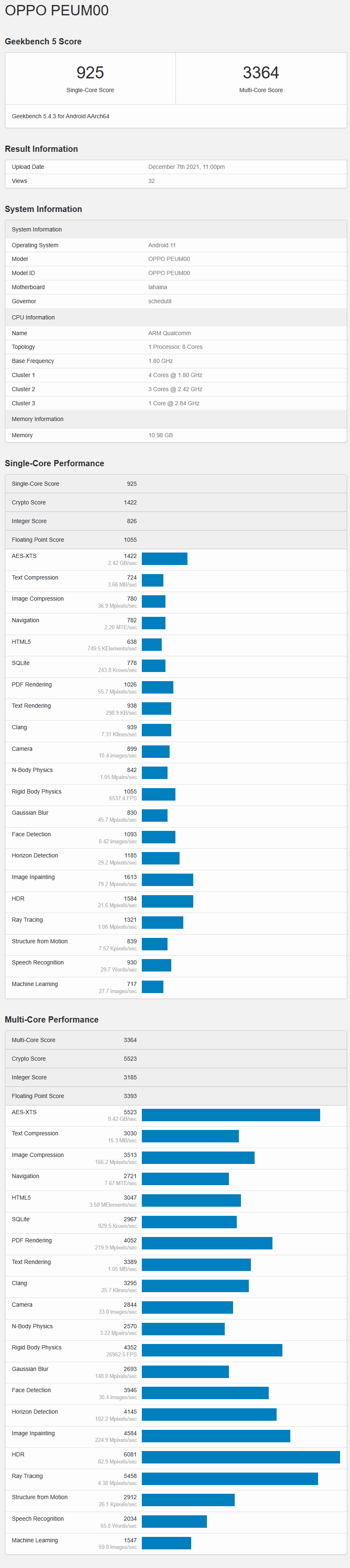 Geekbench 显示,OPPO PEUM00 搭载高通骁龙 888 芯片或 888 Plus,基本频率为 1.80GHz ,运行 Android 12,还配备了 12 GB RAM,Geekbench 4 单核测试 4582 分,多核则为 14371 分;Geekbench 5 单核 925 分,多核 3364 分。