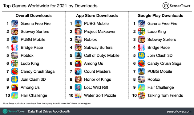 如果看下载量,总体最高的是Garena Free Fire,而苹果平台上下载量最多的是PUBG Mobile(腾讯光子工作室)的绝地求生,也是“吃鸡类”游戏。
