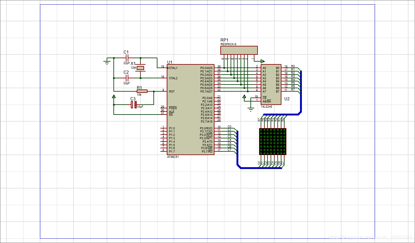 #include #include #define uchar unsigned char #define uint unsigned int uchar code Table_OF_Digits[]= { 0x00,0x3e,0x41,0x41,0x41,0x3e,0x00,0x00, 0x00,0x00,0x00,0x21,0x7f,0x01,0x00,0x00, 0x00,0x27,0x45,0x45,0x45,0x39,0x00,0x00, 0x00,0x22,0x49,0x49,0x49,0x36,0x00,0x00, 0x00,0x0c,0x14,0x24,0x7f,0x04,0x00,0x00, 0x00,0x72,0x51,0x51,0x51,0x4e,0x00,0x00, 0x00,0x3e,0x49,0x49,0x49,0x26,0x00,0x00, 0x00,0x40,0x40,0x40,0x4f,0x70,0x00,0x00, 0x00,0x36,0x49,0x49,0x49,0x36,0x00,0x00, 0x00,0x32,0x49,0x49,0x49,0x3e,0x00,0x00, }; uchar i=0,t=0,Num_Index = 0; void main() { P3 = 0x80; Num_Index = 0; TMOD = 0x00; TH0 = (8192-2000)/32; TL0 = (8192-2000)%32; TR0 = 1; IE = 0x82; while(1); } void LED_Screen_Display() interrupt 1 { TH0 = (8192-2000)/32; TL0 = (8192-2000)%32; P3 = _crol_(P3,1); P0 = ~Table_OF_Digits[Num_Index * 8 +i]; if(++i == 8) i = 0; if(++t == 250) { t = 0x00; if(++Num_Index == 10) Num_Index = 0; } }