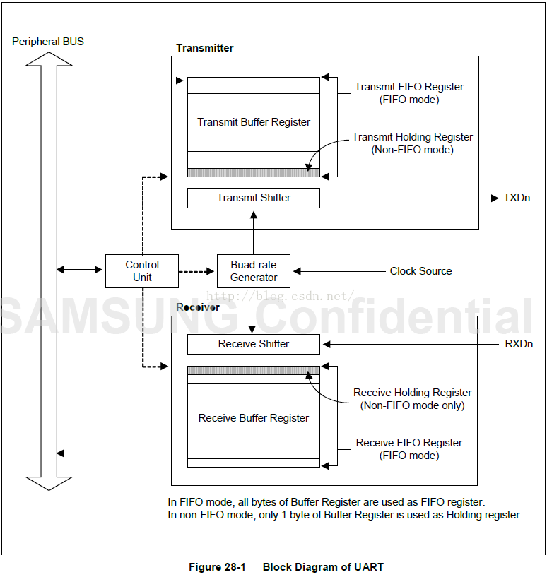 Exynos4412 中UART,有4 个独立的通道,每个通道都可以工作于中断模式或DMA 模式,即 UART 可以发出中断或 DMA 请求以便在UART 、CPU 间传输数据。UART 由波特率发生器、发送器、接收器和控制逻辑组成。