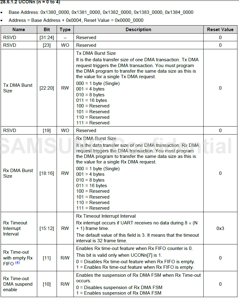 5. 设置UART工作模式:UCONn寄存器(UART CONTROL)