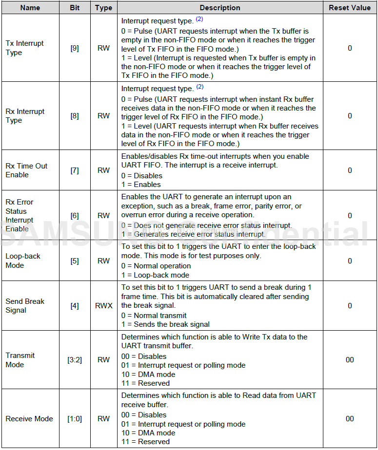 UART0.UCON0 = 0x5; //Interrupt request or polling mode