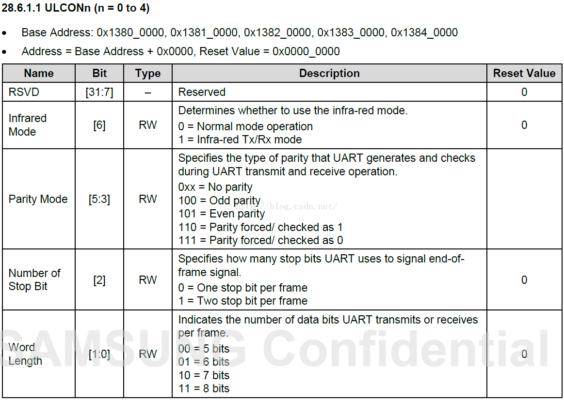 4. 设置传输格式:ULCONn寄存器(UART LINE CONTROL)
