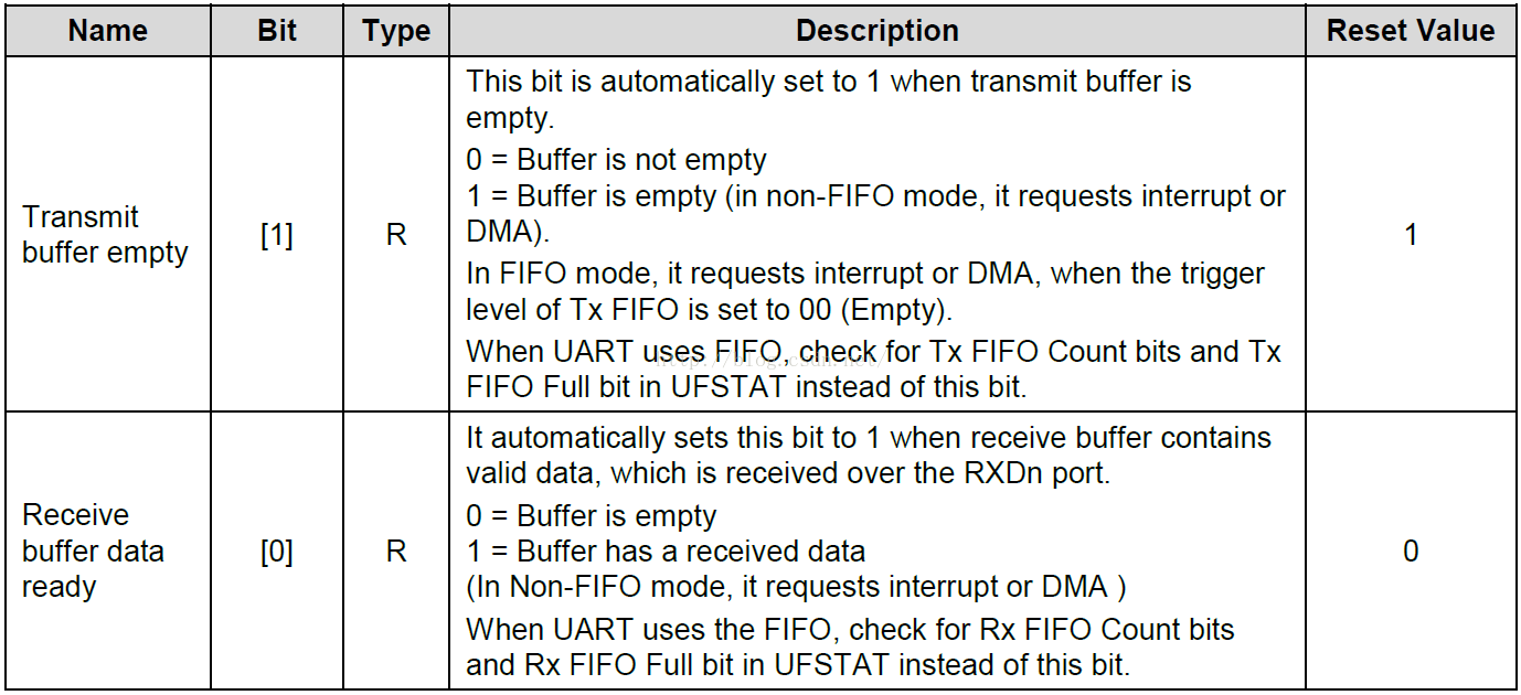 UTRSTAT n寄存器用来表明数据是否已经发送完毕、是否已经接收到数据,格式如下表所示,下面说的“缓冲区”,其实就是下图中的 FIFO ,不使用 FIFO 功能时可以认为其深度为 1。