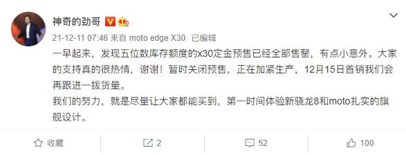 今天一大早,联想中国区手机业务部总经理陈劲在微博发文称,五位数库存额度的 moto edge X30定金预售已全部售罄,暂时关闭预售,正在加紧生产,12月15日首销会再跟进一拨货量。