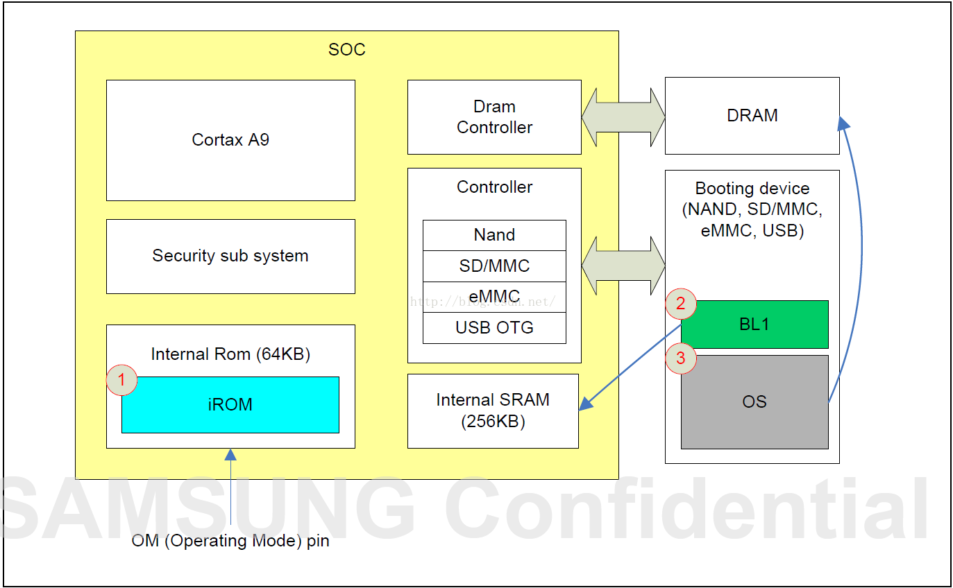 简单地说,iROM就是先设置程序运行环境 (比如关看门狗、关中断、关MMU 、设置栈 、设置栈 、启动 PLL 等 );然后根据OM引脚确定启动设备 (NAND Flash/SD 卡/其他 ),把 BL1 从里面读出存入iRAM;最后启动 BL1 。