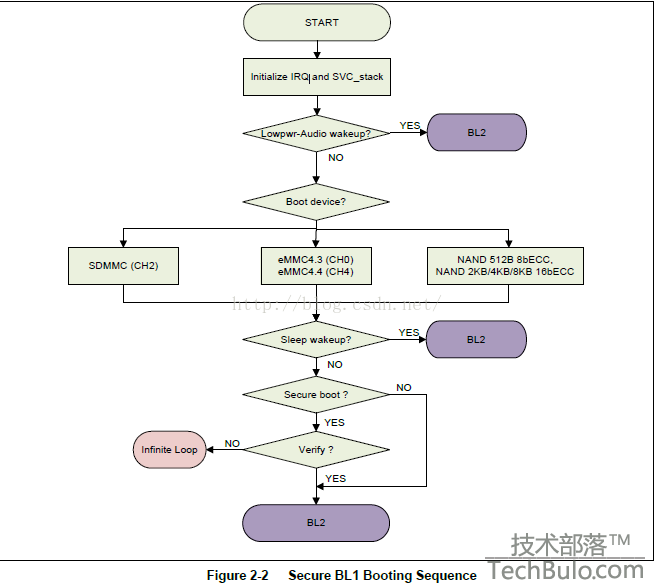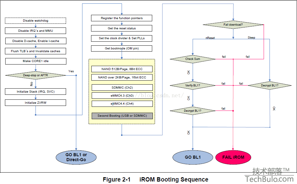 由上图可以看出,首先关闭看门狗,关闭中断及MMU,关闭数据缓存,打开指令缓存,清除TLB,然后将其他核进入IDLE模式,只留CPU0,这里有了第一个跳转分支,IROM判断当前启动模式,是冷启动还是唤醒,如果是唤醒模式,那么就是直接跳转到BL1,在BL1里面我们会再次判断是否是唤醒模式,如果是就直接跳转到唤醒函数,一般都是linux内核的唤醒句柄。当然在裸机里都是冷启动的,休眠唤醒一般是不需要关注的,当然如果你的裸机程序需要支持休眠唤醒,就需要增加相应的代码了。