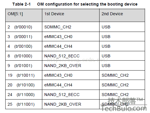 1、在芯片的iROM中已经固化一个代码,当硬件上电后就读取OM电平从而确定硬件设置的启动模式:0110为从eMMC启动,1000位SD卡启动;