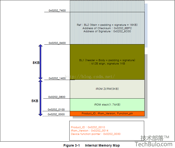 BL1 位于SD卡偏移地址 512字节处(即从第一个扇区开始,前面有一个扇区保留,每个扇区512字节,为什么保留第一个扇区,如果有同学对DOS分区表有过研究,就能明白其中的道理了,第一个扇区是分区表的配置区),iROM从这个位置读入8K 字节的数据,存在iRAM地址 0x02021400位置处。 所以 BL1不能大于8K 。