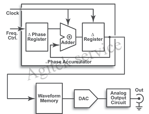 DDS 技术使用一个时钟频率生成仪器范围内的任何频率,来合成波形。图16 以简化形式概括了基于DDS的AFG 结构。